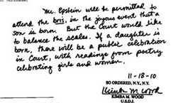 Apparently, like me, Kimba Wood recognizes the unfairness in making a big fuss over a Jewish boy’s birth, but seeing a Jewish girl’s birth as a lesser event. Here is the letter to Judge Kimba Wood by attorney Bennett M. Epstein, with Wood’s response following: