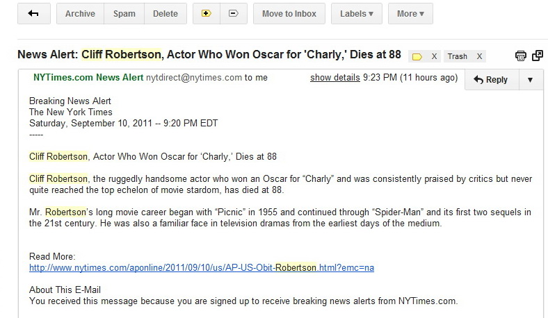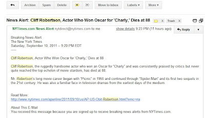 I was surprised last night after Shabbat when the only news alert I saw in my email inbox from the NY Times let me know that actor Cliff Robertson had died. Who was Cliff Robertson? Exactly!