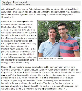 The engagement announcement of former Camp Ramah in Nyack staffers Avi Smolen & Justin Rosen, who will be married this month. |