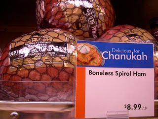 The photo is actually from 2007 and it had nothing to do with Walmart. It was taken at Balducci’s, a specialty food store in New York City (of all places… shouldn’t they know better?). I blogged about this FAIL marketing idea at Balducci’s back in December 2007 and even included some faux holiday sale signs from other stores in my post. A quick search for “Hanukkah Ham” on snopes.com will also let you know that this poor choice in advertising occurred not at Walmart, but at Balducci’s.