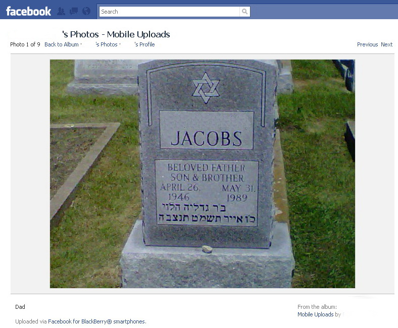 As I am writing this post, I logged into my Facebook account and saw that a friend had posted a photo of his father’s tombstone since today is his father’s yahrzeit (anniversary of the Jewish date of death). I hadn’t known that he lost his father (almost eleven years ago according to the date on the memorial stone) and neither did several of his other friends on Facebook according to their comments to the photo. This photo, simply captioned “Dad,” allows his friends to share their condolences on his father’s yahrzeit.