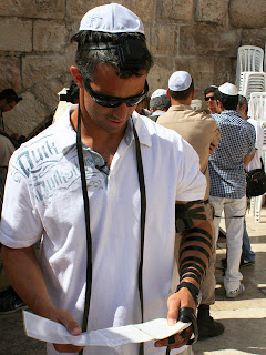 Brad Ausmus wearing a yarmulke and tefillin at the Kotel in Jerusalem while manager of Israel’s World Baseball Classic team.